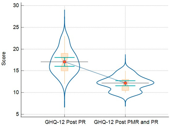Relationship between GHQ-12 results of patients post-PR (left side) and post-PR-and-PMR (right side)—dot-and-line diagram (violin representation with connecting lines, markers, and dots that plot all data).