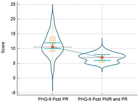 Relationship between PHQ-9 results of patients post-PR (left side) and post-PR-and-PMR (right side)—notched box-and-whisker plot with connecting lines, markers, and bars.