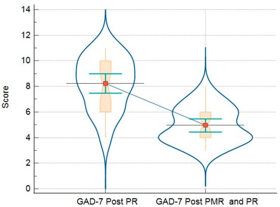 Relationship between GAD-7 results of patients post-PR (left side) and post-PR-and-PMR (right side)—box-and-whisker plot with connecting lines, markers, and intervals.