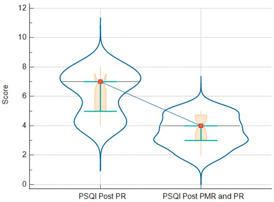 Relationship between PSQI results of patients post-PR (left side) and post-PR-and-PMR (right side)—box-and-whisker plot with connecting lines, markers, and intervals.