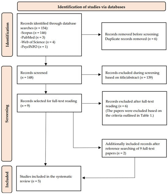 The database search retrieved one hundred and fifty-four records, six of which were identified as duplicates and removed before the screening phase. In the screening phase, based on titles and abstracts, 139 records were excluded. After screening, nine papers were read in full, and six were excluded based on inclusion and exclusion criteria (Table 1). Additionally, two records were included after manually searching the reference lists of selected records and the reference lists of recently published meta-analyses and systematic reviews that addressed the topic of students’ mental health during the COVID-19 pandemic. Ultimately, five studies were included in the systematic review. The PRISMA flow diagram of the literature search is presented in Figure 1.