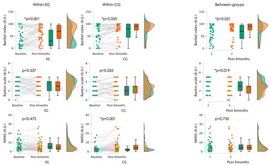 Within the SG, there were significant increases in BS (Z = −3.861; p < 0.001), while no significant differences were found between baseline and post 6 months in RS (Z = −0.617; p = 0.537) and NIHSS (Z = −0.715; p = 0.475). Regarding the CG, significant increases were observed in BS (Z = −2.821; p = 0.005) and NIHSS (Z = −3.954; p < 0.001), while no significant differences were found in RS (Z = −0.964; p = 0.335).