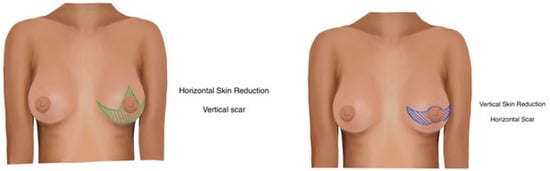 In recent decades, due to advancements in breast screening and early detection of cancer, there has been a steady increase in the number of patients undergoing mastectomy for breast cancer treatment []. Consequently, the demand for breast reconstruction surgeries has escalated. Patients with large breasts pose a considerable challenge for plastic surgeons due to the heightened morbidity, increased risk of surgical complications, contributory risk factors, and compromised tissue quality []. In response to these challenges, innovative surgical techniques have been developed for the reconstruction of significantly large breasts. Among them, the skin-reducing mastectomy (SRM) technique has gained progressive prominence. It effectively reduces excess skin after mastectomy, providing a more anatomical breast shape and facilitating the creation of a suitable prosthetic pocket for either an implant or a tissue expander. Despite its benefits in achieving good symmetry with the contralateral breast and favorable cosmetic outcomes, SRM is associated with a higher incidence of complications, particularly concerning the viability of the mastectomy flaps []. To mitigate such risks, a horizontal incision skin reduction technique has been introduced by Kontos et al. [], which significantly lessens the likelihood of vascularization impairments. However, this method could result in a more conspicuous scar and potential asymmetry with the contralateral breast especially in case of inverted T mastopexy or reduction. Given the lack of comparative studies between these two SRM techniques, our research aims to evaluate the differences in clinical and surgical outcomes, assess aesthetic quality, and determine complication rates, patient satisfaction, and healing times.