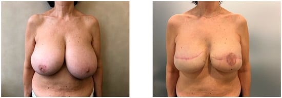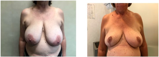 - Kontos, M.; Lanitis, S.; Constantinidou, A.; Sakarellos, P.; Vagios, E.; Tampaki, E.C.; Tampakis, A.; Fragoulis, M. Nipple-Sparing Skin-Reducing Mastectomy with Reconstruction for Large Ptotic Breasts. J. Plast. Reconstr. Aesthetic Surg. 2020, 73, 690–695. [Google Scholar] [CrossRef] [PubMed]