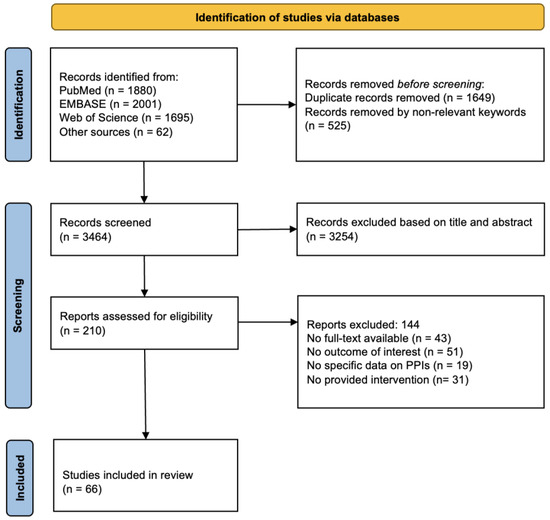 A systematic search of the literature was performed in the PubMed, Embase, and Web of Science databases for articles published from 1 January 1989 (the first year of PPI commercialization) to 30 September 2024. In addition to the electronic searches, the references of all included articles were crosschecked. The search strategy combined headings and keywords identified according to the PICOS (Population, Intervention, Comparison, Outcome, Study design) Model [19,20], including the following: studies on adult patients receiving any PPI deprescribing approaches; evaluating any type of PPI deprescribing intervention, addressing different healthcare professionals (i.e., physicians, clinicians, pharmacists, nurses) or patients, in different settings (i.e., nursing homes, hospitals, pharmacies); compared with no intervention or standard care; reporting implementation rate (primary outcome) or effects on symptoms (secondary outcome); designed as clinical trials and observational studies. The Boolean operators AND/OR were employed. An example of this searching strategy is reported in the Supplementary Materials section.
