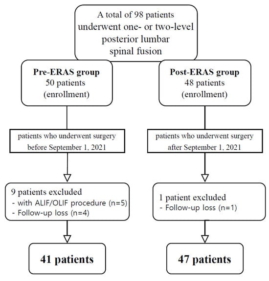 This retrospective cohort study, conducted at the Asan Medical Center, focused on 98 patients with lumbar degenerative disease who had undergone one- or two-level posterior lumbar spinal fusion between March 2021 and February 2022. Only patients who had undergone primary surgery were included. Individuals with degenerative or isthmic spondylolisthesis, as well as those with spinal stenosis or neural foraminal stenosis requiring fusion surgery, were eligible for inclusion in this study. Patients who had undergone concomitant procedures such as anterior lumbar interbody fusion (ALIF) or oblique lumbar interbody fusion (OLIF) were excluded. Thus, 88 patients were included in the final analysis after the exclusion of 10 cases. The ERAS protocol was implemented in September 2021. The patients were allocated into two groups: those who had undergone surgery before the implementation of the ERAS protocol (pre-ERAS group, n = 41) and those who had undergone surgery after its implementation (post-ERAS group, n = 47) (Figure 1).