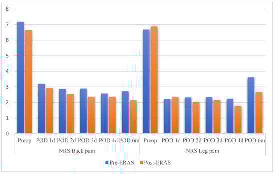 Further analysis using the Linear Mixed Effects Model showed that the time:group interaction was not statistically significant for either back pain NRS (p = 0.848) and leg pain NRS (p = 0.503), indicating that the pattern of pain scores over time did not differ significantly between the pre-ERAS and post-ERAS groups.