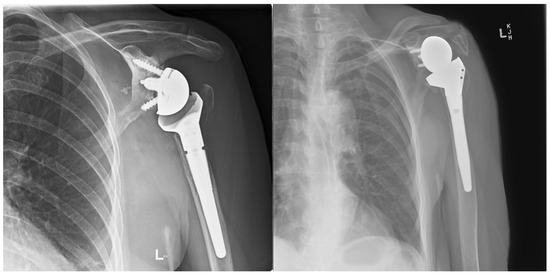- Houdek, M.T.; Wagner, E.R.; Rose, P.S.; Barlow, J.D.; Elhassan, B.T.; Sanchez-Sotelo, J. Allograft prosthetic composite reconstruction using a reverse total shoulder arthroplasty for failed oncologic proximal humerus reconstruction. J. Surg. Oncol. 2022, 125, 775–781. [Google Scholar] [CrossRef]