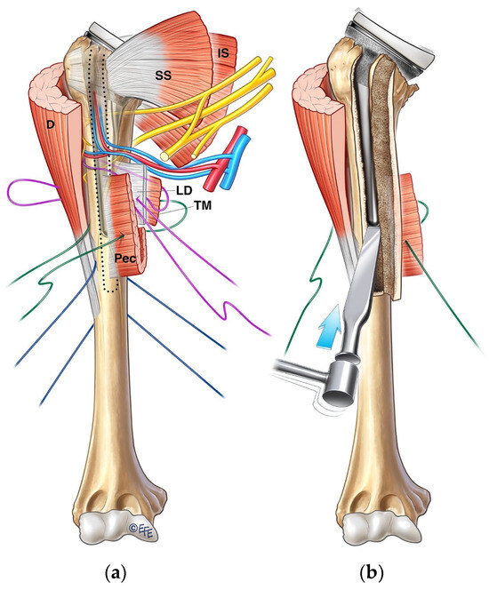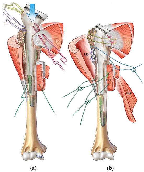 (a) Cementing of APC construct onto native humerus. (b) Reattachment of tendons: posterosuperior cuff and subscapularis, latissimus dorsi (LD), pectoralis major (Pec), and teres major (TM).