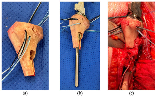 Once the allograft length and height are confirmed, it is deconstructed at the back table with the humeral trial component removed. Multiple all-suture anchors (2.9 mm JuggerknotTM Zimmer Biomet, Warsaw, Indiana) are inserted into the proximal humeral allograft to provide anchor points for the reattachment of soft tissues when the allograft used is devoid of any tendon stumps (Figure 6a,b). Rotator cuff tendons can be reattached onto the tuberosities, and the latissimus dorsi, teres major, and pectoralis major tendons, which were detached earlier with their bony insertions, can be wrapped around the humeral allograft using these sutures to allow for firm union of the tendon–bone unit onto the APC construct. The deficiency of a posterior cuff necessitates a latissimus dorsi tendon transfer for stability and function.