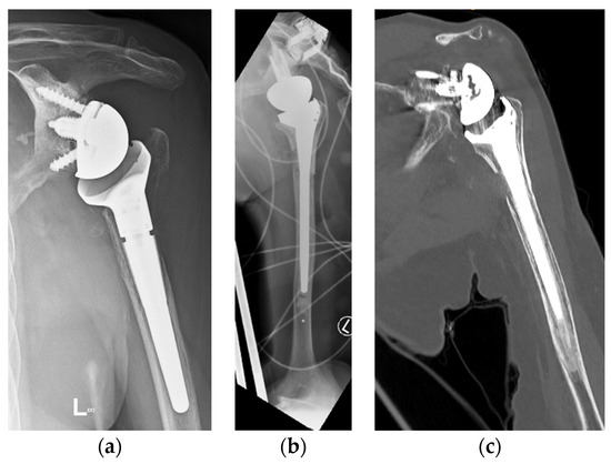 - Shukla, D.R.; Lee, J.; Mangold, D.; Cofield, R.H.; Sanchez-Sotelo, J.; Sperling, J.W. Reverse Shoulder Arthroplasty With Proximal Humeral Replacement for the Management of Massive Proximal Humeral Bone Loss. J. Shoulder Elb. Arthroplast. 2018, 2, 2471549218779845. [Google Scholar] [CrossRef]