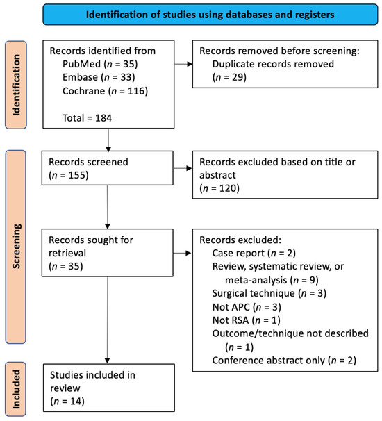 A systematic review was conducted following the Preferred Reporting Items for Systematic Reviews and Meta-Analyses (PRISMA) guidelines [18]. A comprehensive search of the PubMed, Embase, and Cochrane databases was performed by two reviewers (KI and CC), with queries referred to the senior author (AG) from inception to August 1, 2024. Any conflicts were resolved via discussion or referral to the senior author (AG). The following search terms were used: (“proximal” AND “humer*” AND “reverse shoulder”) AND (“allograft” AND “prosthe*” AND “composite”) (see Supplementary Materials for the detailed search strategy). The initial query yielded 184 reports. After removing the duplicates, 155 unique articles remained. The titles and abstracts were manually reviewed to identify papers reporting on the technical details of the use of an APC in revision RSA, with non-relevant articles excluded, resulting in 35 potential articles. Studies categorized as case reports, reviews, systematic reviews or meta-analyses, technical notes, articles without the use of RSA, and conference abstracts were excluded. Ultimately, 14 studies reporting on 255 APC-RSA procedures were included in the systematic review, with the basic patient demographics synthesized and presented and missing data reported as not available. As this review focused on surgical techniques, no risk-of-bias assessment was performed. No additional studies were identified as relevant through the manual search. Studies involving primary APC-RSAs were also included, in addition to APC-RSAs in revision cases, to allow for a comprehensive review of the technical details of all APC-RSAs. A flow diagram outlining the study selection process is provided in Figure 9.