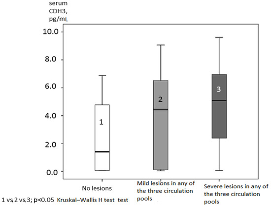 CDH3 content (pg/mL) in patients without lesions, with mild lesions, and with hemodynamically significant lesions in any of the tree circulation pools (coronary, brachycephalic, and femoral).