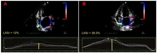 Figure 2 illustrates the representative examples of LASr calculation from the apical four-chamber view in a patient with persistent AF of greater than 3 months’ duration and previous AF history planned for ECV (Panel A), and in a healthy individual without AF (Panel B).