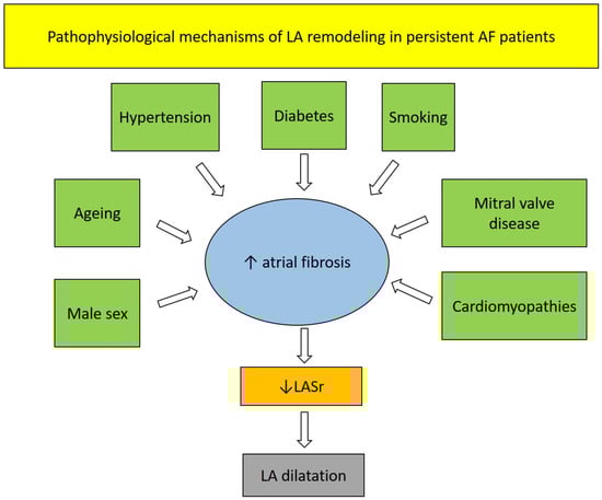 LASr is a reliable surrogate of atrial fibrosis, which has been found to show a good correlation with both histology [95,96] and regional late gadolinium enhancement findings [48,97]. LASr impairment is a marker of AF-induced atrial cardiomyopathy, characterized by early interstitial collagen deposition leading to increased LA fibrosis and stiffness. These microstructural changes generally occur before LA enlargement and may be detected early by strain echocardiographic imaging [98]. Several concomitant pathophysiological conditions, such as mitral valve disease, hypertension, CAD, and cardiomyopathies may contribute to the chronicity of LV afterload elevation, causing an increase in LVFPs and leading to progressive LA dysfunction and enlargement [99,100,101] (Figure 3).