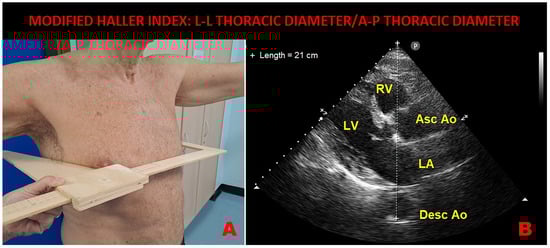 - Sonaglioni, A.; Baravelli, M.; Vincenti, A.; Trevisan, R.; Zompatori, M.; Nicolosi, G.L.; Lombardo, M.; Anzà, C. A New modified anthropometric haller index obtained without radiological exposure. Int. J. Cardiovasc. Imaging 2018, 34, 1505–1509. [Google Scholar] [CrossRef] [PubMed]
