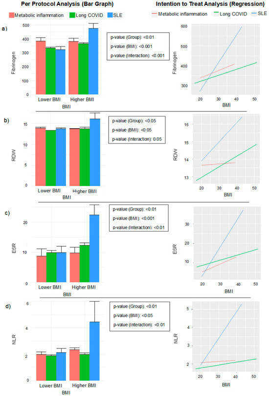 The bar graphs and graphic visualization of the linear models of (Figure 1a) fibrinogen, (Figure 1b) RDW, (Figure 1c) ESR and (Figure 1d) and NLR were compared by the type of disease and by BMI status (lower and higher) for each disease group (MI, LC and SLE), using per protocol and intentions to inform treatment approaches. BMI, Body Mass Index; ESR, erythrocyte sedimentation rate; LC, long COVID; MI, metabolic inflammation; NLR, neutrophil/lymphocyte ratio; RDW, red cell blood distribution width; SLE, systemic lupus erythematosus.