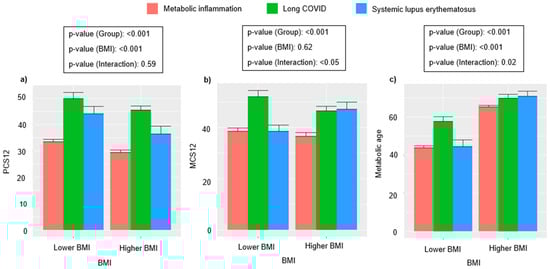The dichotomized BMI distribution and the three inflammatory groups were analyzed in relation to PCS12 (Figure 2a). This analysis evidenced that there was an inverse relationship between BMI and PCS12 values for MI, LC and SLE. Thus, when the BMI increased, the PCS12 values decreased in this population. When the relationship between BMI and MCS12 was analyzed, an interaction between BMI and disease group was found (Figure 2b), showing that MCS12 was higher when the BMI was lower, while when the BMI increased; the mean value of MCS12 decreased for LC and MI patients. Interestingly, the values of MCS12 were higher for patients with SLE and a higher BMI. The third graph in relation to metabolic age (Figure 2c) illustrates that when the BMI is lower, the mean value of the metabolic age is reduced for every group of inflammatory disease, showing a direct relationship.