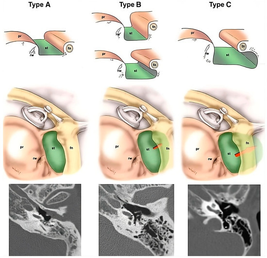 Classification of depth of the sinus tympani, based on an axial CT scan. Type A: small sinus tympani. Type B: deep sinus tympani. Type C: deep sinus tympani with posterior extension. Fn, facial nerve; pr, promontory; rw, round window; st, sinus tympani.