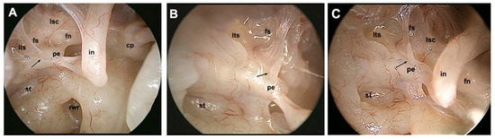 Endoscopic assessment of the facial sinus with differently angled endoscopes. (A): 0° endoscope. (B): 45° endoscope. (C): 70° endoscope. Black arrow indicates an incomplete chordiculus. Cp, cochleariform process; fn, facial nerve; fs, facial sinus; in, incus; lsc, lateral semicircular canal; lts, lateral tympanic sinus; pe, pyramidal eminence; rwr, round window region; st, sinus tympani.