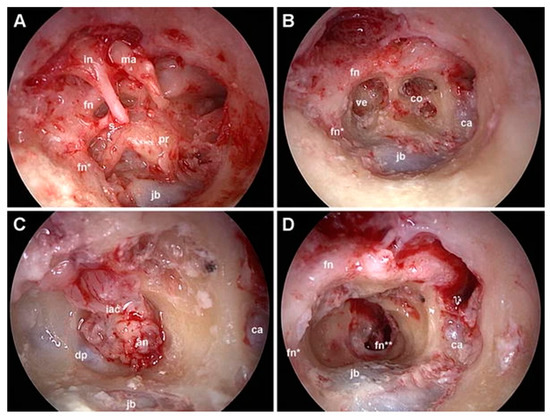 - Cornu, N.; Marchioni, D.; Eliezer, M.; Verillaud, B.; Hautefort, C.; Green, A.; Marc, M.; Bresson, D.; Froelich, S.; Herman, P.; et al. Endoscopic Decompression of the Labyrinthine Segment of the Facial Nerve. Otol. Neurotol. 2020, 41, 1433–1437. [Google Scholar] [CrossRef]