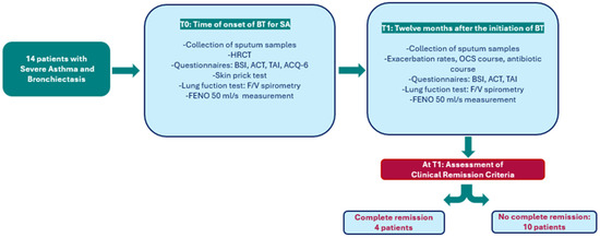 T1 (12-Month Follow-Up): Twelve months after the initiation of BT, the same parameters were reassessed to evaluate the achievement of complete clinical remission. This included repeated lung function tests, a review of exacerbation rates, OCS usage, and antibiotic use. The ACT, ACQ-6, and TAI scores were also reevaluated. Further, the impact of bronchiectasis on remission was assessed using the Bronchiectasis Severity Index (BSI) and FACED score. The remission criteria were defined according to the Severe Asthma Network Italy (SANI) guidelines, which required the absence of OCS use, no asthma-related symptoms, no exacerbations, and stable lung function.