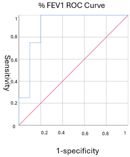 To further evaluate the predictive power of lung function parameters, ROC curve analysis was conducted. The FEV1 percentage demonstrated an AUC of 0.900 (95% CI: 0.732–1.0, p = 0.024), indicating excellent discriminative ability in predicting complete remission. The optimal FEV1 cutoff value was determined to be 72.5%, which provided a sensitivity of 100% and a specificity of 70%. The FVC percentage also showed strong predictive accuracy with an AUC of 0.850 (95% CI: 0.639–1.0, p = 0.048) and an optimal cutoff of 91%, achieving the same sensitivity and specificity values (Figure 3).
