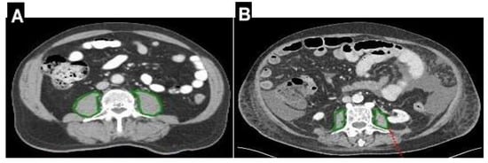 Axial CT images at the L3 vertebral level. The green line shows the outline of the psoas muscle. Measurements were performed in a semi-automated fashion with manual outlining of psoas muscle borders. Two pictures of axial CT images in two different patients are shown: (A) a patient with mild pancreatitis and PMA 28 cm2 and (B) a patient with PMA 11 cm2 and marked ascites.
