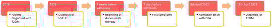 A 73-year-old female with a previous history of well-controlled T2DM, diagnosed 6 years earlier and treated with metformin, and autoimmune thyroiditis visited the emergency room due to polydipsia, polyuria, and general weakness. The symptoms occurred abruptly and were observed by the patient within the last seven days. The patient started immunotherapy with durvalumab 6 weeks before her admission as a consolidation treatment for non-small cell lung carcinoma. The patient was diagnosed with NSCLC in 2022 and treated with chemotherapy (1 cycle of vinorelbine/carboplatin) at the beginning. Laboratory findings showed hyperglycemia—510 mg/dl, pH—7.14, HbA1c—8.7%, and keto- and glucosuria. Thyroid hormone levels were within normal limits. Treatment with fluids and continuous IV insulin infusion was initialized, followed by functional intensive insulin therapy. Finally, the patient’s general condition and laboratory findings improved. A glucose monitoring system was installed to monitor the patient’s glycemia continuously. Anti-GAD antibodies were detected at 1645.2 IU/mL, while the patient’s serum C-peptide level was low at 0.15 ng/mL. These laboratory findings concluded the diagnosis of T1DM, most likely related to immunotherapy. After DKA, durvalumab therapy was continued with a good response to the treatment. During further observation, the patient required adjustment of levothyroxine treatment, due to thyroid dysfunction with rapidly developing hypothyroidism (TSH 75 ug/mL). The timeline of the patient’s medical history is presented in Figure 1.