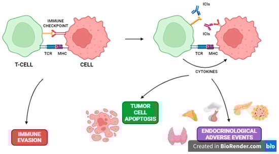 The dysregulation of T-cell response via ICIs has not only a positive anti-tumor effect, but might also lead to several immune-related adverse events (irAE) []. The immune-related endocrine insufficiencies were described for each ICI used in clinical practice. Several theories are trying to clarify the mechanism of the concomitant occurrence of irAEs and ICI therapy. Among them, the dysregulation of peripheral T-cell tolerance and the decreased activity of T-regulatory lymphocytes (Treg) are the most studied ones; however, the activation of autoreactive B-cells, the disruption of cytokine signaling, and microbiota imbalance may also play a role in this process []. Indeed, the blockage of checkpoint inhibitors, which prevent immune evasion of tumor cells, leads to the activation of autoreactive T-cell expansion, which translates into irAEs (Figure 2). However, the activation of autoantibodies after the use of ICIs is as high as 19.2%, which shows the involvement of this mechanism in irAE occurrence [].