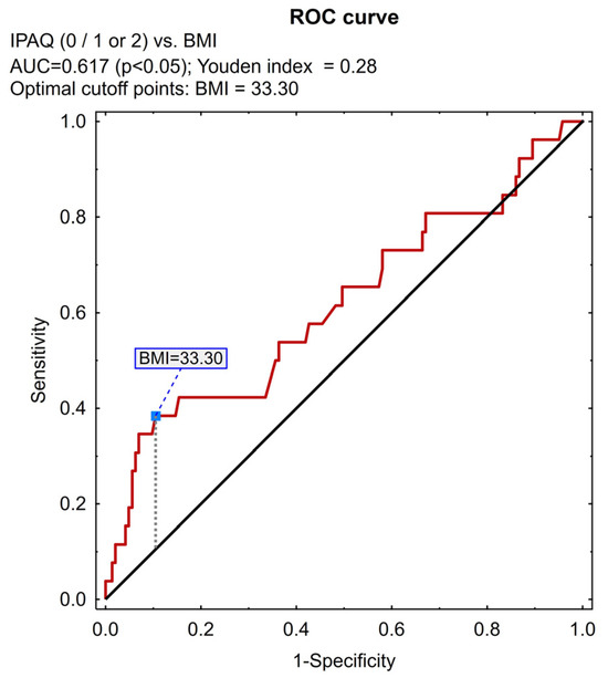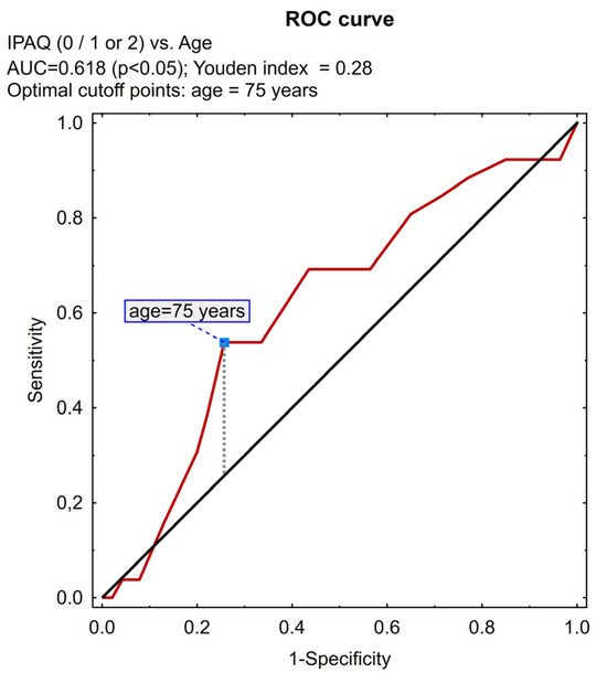 The ROC analysis allowed us to determine the BMI value of 33, 3 and age of 75 years as the differentiating point, considering IPAQ scoring (divided into two parts: insufficient vs. at least sufficient PA). People with BMI > 33.3 and >75 years of age (Figure 1 and Figure 2, respectively) more often obtained the value 0—“insufficient level of PA”—on the IPAQ scale; the IPAQ value of 1 or 2 more often related to people ≤ 75 years of age (p = 0.044; chi-squared test). There was no difference between men and women with regard to the IPAQ scores.