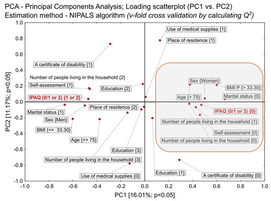 PCA grouped data from basic descriptives (Supplementary File S2—Table S1, Part A) related to the value of IPAQ = 0 (insufficient level of physical activity) (Figure 3). The PCA ordered the variables according to how close they were together and thus revealed their relationship. Variables located close to: IPAQ = 0, therefore, showed the patient characteristics most typical of insufficient PA (Figure 3, red circle).
