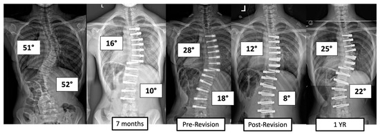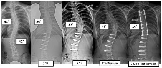 The incidence of TB in the literature has ranged widely (27–73%) and may be even higher as we typically rely on radiographic evidence of breakage [3,4,14,15]. Our TB rate of 49% is consistent with what has been reported in the thoracic VBT literature but lower than what has been reported for lumbar curvatures [3,4]. Baroncini et al. performed an analysis of 105 patients (69 lumbar curves; 84 thoracic curves) who experienced early TB (within 1 year of the index procedure). Of those who experienced breakage, there was a higher incidence amongst lumbar curves (71%) than thoracic (29%) [23]. They suspected that this was due to either the greater range of motion in the lumbar spine or differences in orientation of the facet joints between the thoracic and lumbar spine. In a study on the Lenke 6 curve type, there has been support for bilateral VBT in achieving a significant correction of T and TL curves at a minimum of 24 months post operation [24]. Although TB and loss of correction have been observed, breakage while associated with a segmental loss of correction does not necessarily require re-operation or result in a lack of clinical success (major curve <35%) [1,4,14]. Of the 18 patients in our cohort who experienced TB, 15 (83%) were still clinically successful. Previously, we found a 30% breakage rate of thoracolumbar tethers at the 2-year time point, suggesting that rates increase over time given our 49% rate at 3–6 years [14]. Tether breakage does not appear to be associated with a high revision rate, at least out to the length of the follow-up we report. Of the patients who have been revised in this series (8.1% rate), only one patient who had tether breakage required a revision related to curve progression. This was in a patient in whom a TL tether was performed, breakage occurred, and moderate progression of the TL major curve occurred along with progression of the secondary thoracic curve. This was treated with posterior fusion of the thoracic spine and revision of the TL tether (Figure 3). The interplay between the number of cords and skeletal maturity in outcome durability will require larger data sets. The authors have tended to use single-cord constructs in the lumbar spine when the patient had not yet reached peak height velocity with the expectation that growth modulation would drive correction and maintenance, and a double cord might lead to overcorrection due to a more powerful convex tethering force [25]. The authors routinely use double-row cords for TL major curves for patients who have surpassed peak height velocity and/or patients with curves >60 degrees, regardless of skeletal maturity.