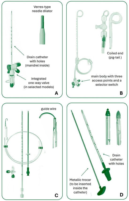 Main types of pleural drainage with details of the tips. (A): small-bore straight catheter with a Verres-type needle dilator; (B): small-bore pig-tail catheter; (C): small-bore straight catheter with guide wire for placement by means of the Seldinger technique; (D): large-bore catheter with trocar.