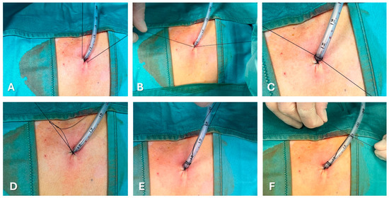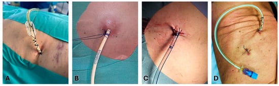 Figure 3 and Figure 4 show the most common methods for anchoring a pleural drain and the progressive steps to secure a large-bore chest tube using the purse-string technique. A recent multicenter trial compared a ballooned 12 Fr intercostal drain to a similarly sized tube secured with a single suture. The balloon integrated into the drain works like a bladder catheter which can be inflated with sterile water when it lies inside the pleural space to prevent it from slipping out [67]. The analyses of displacement rate showed a trend favorable to ballooned drain, although not statistically significant (3.9% vs. 10.1%). The control group’s displacement rate was less than expected in real-life practice, probably due partially to the high degree of utilization of ultrasound during the study.