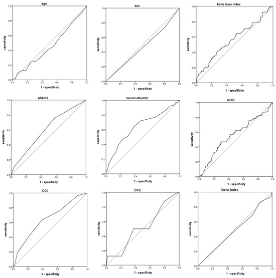 We analyzed all variables applied to the regression analysis using the ROC curve (Figure 1). The area under the curve (AUC) of age, sex, BMI, ASA PS, serum albumin, the GnRI, CCI, CFS, and the Koval index were 0.457 (95% CI 0.388–0.526; p = 0.223), 0.467 (95% CI 0.397–0.538; p = 0.352), 0.565 (95% CI 0.493–0.637; p = 0.065), 0.605 (95% CI 0.539–0.672; p = 0.003), 0.647 (95% CI 0.576–0.717; p < 0.001), 0.561 (95% CI 0.488–0.634; p = 0.083), 0.648 (95% CI 0.580–0.715; p < 0.001), 0.523 (95% CI 0.321–0.725; p = 0.828), and 0.486 (95% CI 0.373–0.599; p = 0.808), respectively. The optimal cut-off values of significant variables (ASA PS, serum albumin, and CCI) were 3 (sensitivity, 75.9%; specificity, 51.8%), 3.65 g/dL (sensitivity, 72.2%; specificity, 52.7%), and 6.5 (sensitivity, 63.3%; specificity, 61.4%), respectively. The optimal cut off value for the GnRI was not derived.