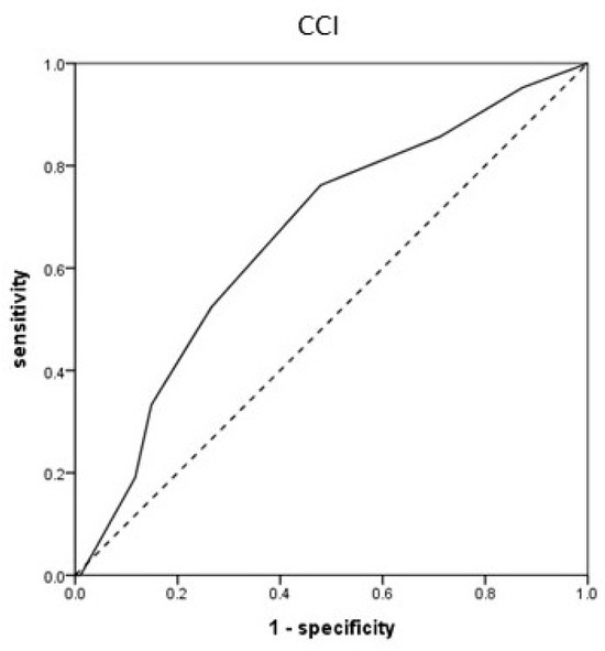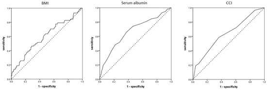 In males, the AUC of the CCI was 0.664 (0.537–0.790; p = 0.019), and the optimal cut-off value was 6.5 (sensitivity, 76.2%; specificity, 52.1%) (Figure 2). In females, the AUC of BMI was 0.598 (95% CI 0.515–0.681; p = 0.016), and the optimal cut-off value was 22.3 kg/m2 (sensitivity, 58.6%; specificity, 55.2%). The AUC of serum albumin levels was 0.670 (0.590–0.749, p < 0.001), and the optimal cut-off value was 3.55 g/dL (sensitivity, 65.5%; specificity, 62.9%). The AUC of the CCI was 0.636 (0.557–0.715; p = 0.001), and the optimal cut-off value was 6.5 (sensitivity, 58.6%; specificity, 63.7%) (Figure 3).