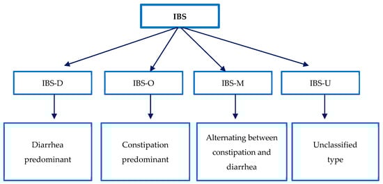 The Rome IV criteria classify IBS into four subtypes (Figure 2) considering the predominant intestinal alteration evaluated by the “Bristol Stool Form Scale”. This scale is a tool used to evaluate bowel habits and should be used to record stool consistency, ranging from watery stools to obstipation [59].