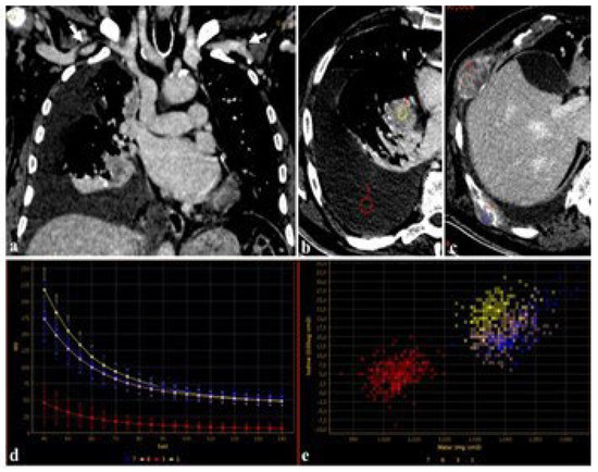 An 83-year-old male candidate for transcatheter aortic valve implantation (TAVI) submitted to DECT examination. The study of the thoracoabdominal aorta (a), performed with 85 mL of contrast media for the evaluation of peripheral accesses ((a), arrows), revealed a pulmonary right hilar cancer (b) with osteolytic bone metastases (c). After drawing circular regions of interest (ROIs) within right hilar mass, pleural effusion (b), and bone metastases (c), the attenuation was measured at the given energy level, demonstrating the absence of disease in the pleural effusion (b,d,e), further confirmed by spectral iodine maps ((d), spectral curve, (e), scatterplot GSI).