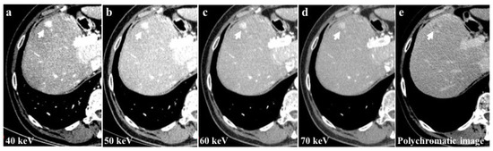 The 40 keV images of a 56-year-old patient with hepatocellular carcinoma (HCC) of the 8th liver segment (a) showed a higher contrast media attenuation and the highest difference between the background parenchymal and the lesion enhancement (arrows) compared to 50 keV (b), 60 keV (c), and 70 keV (d) image reconstructions. Monochromatic energy levels (40–70 keV) also increase the detectability of small HCCs and cirrhotic liver disease when compared to conventional polychromatic imaging (e).
