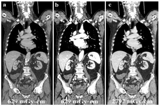 A young male patient receiving chemotherapy for a primary mediastinal large B-cell lymphoma submitted to routine DECT follow-up after 70 mL of contrast media administration (a), and evaluated at low energy levels (40 keV, (b)) to reduce the iodine load and maintain a high diagnostic accuracy. Low energy levels (b) were as accurate as SECT (c) in confirming no recurrence of disease with considerable advantages in the patient’s dose exposure (total DLP: (a,b), 629.18 mGy-cm; (c), 2797.25 mGy-cm).
