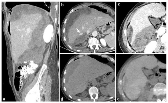 Images at 40 keV after 80 mL contrast medium (a–c) show the presence of an active bleeding liver ((b), arrow) and a diffuse subcapsular hematoma after cholecystectomy in a 76-year-old woman. The patient was rapidly referred to percutaneous angiographic treatment. True non-contrast imaging (d) may be replaced by virtual non-contrast reconstructions (e) in the evaluation of subcapsular hematoma avoiding unnecessary scans without contrast medium during post-embolization follow-up.
