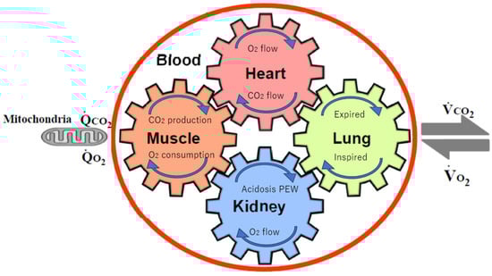 The five major determinants of VO2max, peak VO2, and their relationships (adapted from [30]). The gears represent the functional interdependence of the physiological components of the system. Cardiac output, pulmonary diffusion capacity, oxygen carrying capacity, renal function, metabolic acidosis, and other peripheral limitations, such as muscle diffusion capacity, mitochondrial enzymes, and capillary density, are all examples of VO2max determinants. VO2, O2 uptake; VCO2, CO2 output; QCO2, CO2 production; QO2, O2 consumption by cells.