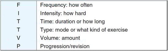 FITT-VP Principles of Exercise Prescription (adapted from Ref. [36]). Rehabilitation prescriptions have been determined based on the FITT-VP, which adds exercise volume (V) and incremental increase/correction (P) to the FITT (frequency (F), intensity (I), time (T), and type (T)). V is the product of “FIT,” i.e., the frequency, intensity, and duration of exercise.