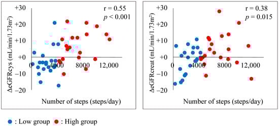 Association between the number of steps and ΔeGFRcys or ΔeGFRcreat (adapted from [40]). The association between the number of steps taken and eGFRcys in all patients is shown. Pearson’s correlation analysis revealed significant correlations between the number of steps and both eGFR parameters, with a higher correlation between ΔeGFRcys and the number of steps than between ΔeGFRcreat and the number of steps. eGFRcreat, creatine-based estimated glomerular filtration rate; eGFRcys, cystatin-based estimated glomerular filtration rate.