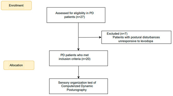 Individuals with other neurological (such as stroke, multiple sclerosis, or other neurodegenerative diseases), musculoskeletal (e.g., severe arthritis or orthopedic conditions detrimental to gait or postural control), and cognitive or psychological conditions causing gait and postural control disruption were excluded. Patients whose postural disturbances were unresponsive to levodopa were also excluded.