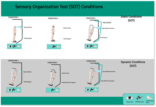Three static and three dynamic sensory organization test (SOT) conditions of Computerized Dynamic Posturography [26].