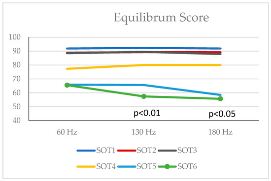 There were no differences in equilibrium scores of SOT4 and SOT5 conditions. There was a difference between the Equilibrium values at 60 Hz, 130 Hz, and 180 Hz in the SOT6 position (p < 0.01). According to Friedman’s Multiple Comparisons (post hoc) test results, there was a difference between Equilibrium values at 60 Hz and 130 Hz and between Equilibrium values at 60 Hz and 180 Hz. Equilibrium values at 130 Hz were lower than the Equilibrium values measured at 60 Hz (p = 0.004), and Equilibrium values at 180 Hz were lower than the Equilibrium values measured at 60 Hz (p = 0.028). There was no difference between Equilibrium values at 130 Hz and 180 Hz (p > 0.05) (Table 2, Figure 3).