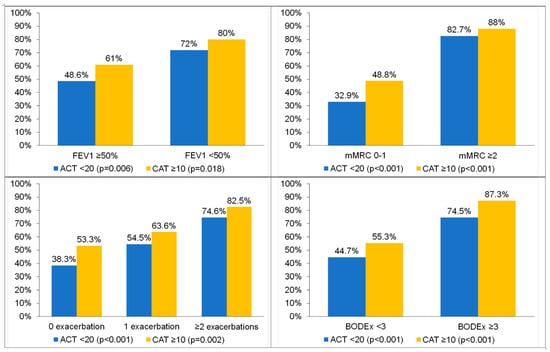 Percentages of patients with poor control (ACT < 20) or high impact of symptoms (CAT ≥ 10) according to different markers of severity of chronic respiratory disease. p = 0.006 and p = 0.018 for comparison between FEV1 < 50% and FEV ≥ 50% in the ACT and CAT, respectively. p < 0.001 and p < 0.001 for comparison between mMRC 0–1 and mMRC ≥ 2 in the ACT and CAT, respectively. p < 0.001 and p = 0.002 for comparison between 0 exacerbations, 1 exacerbation and ≥ 2 exacerbations in the ACT and CAT, respectively. p < 0.001 and p < 0.001 for comparison between BODEx < 3 and BODEx ≥ 3 in the ACT and CAT, respectively.