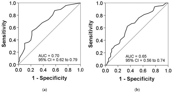 Receiver-operating characteristic (ROC) curves for the (a) ACT and (b) CAT scores as predictors of exacerbations: (a) area under the curve (AUC), 0.70; cut-off, 17.5; sensitivity, 54.2%; and specificity, 78.3% and (b) AUC, 0.65; cut-off, 12.5; sensitivity, 62.5%; and specificity, 65%. DeLong’s test indicated no significant difference between both AUCs (p = 0.351).